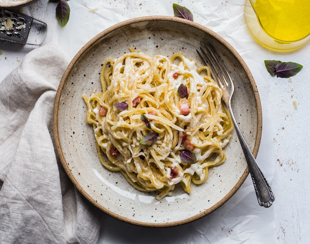 Salt, eggs, pecorino romano, parmesan, black pepper, olive oil, bacon, spaghetti