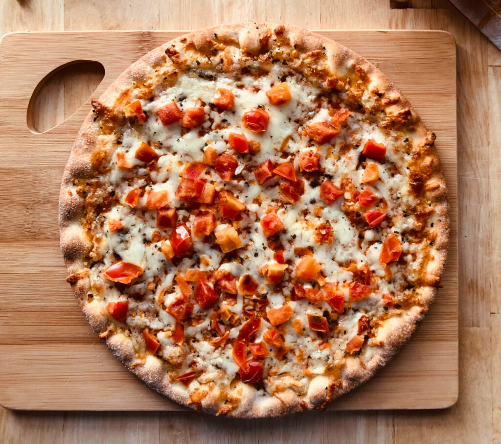 Garlic oil brushed with mozzarella, basil & fresh tomatoes.